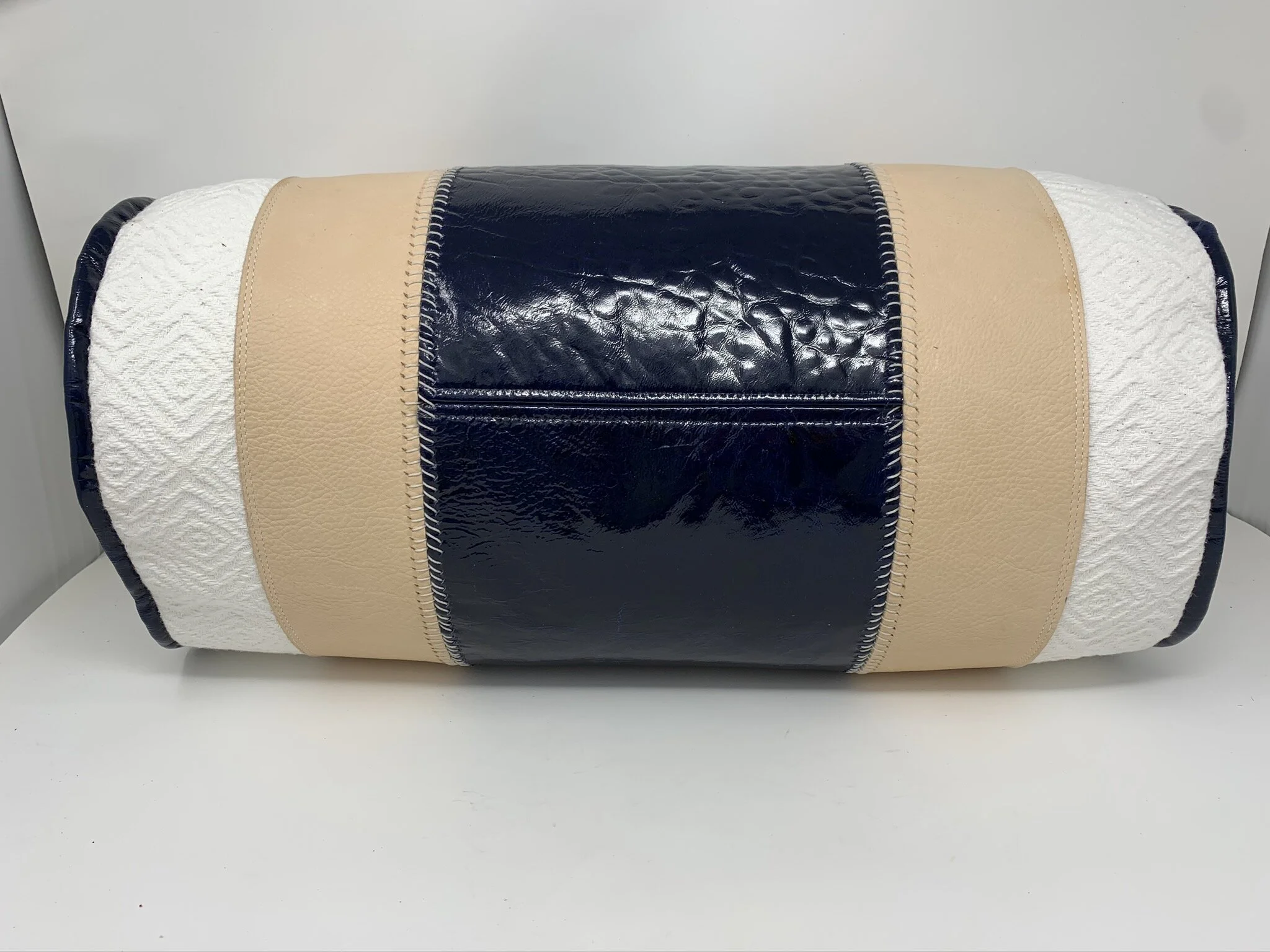 Large bolster - Navy blue patent sheepskin - Natural veg-tanned leather - white cotton hand stitching and brass zipper